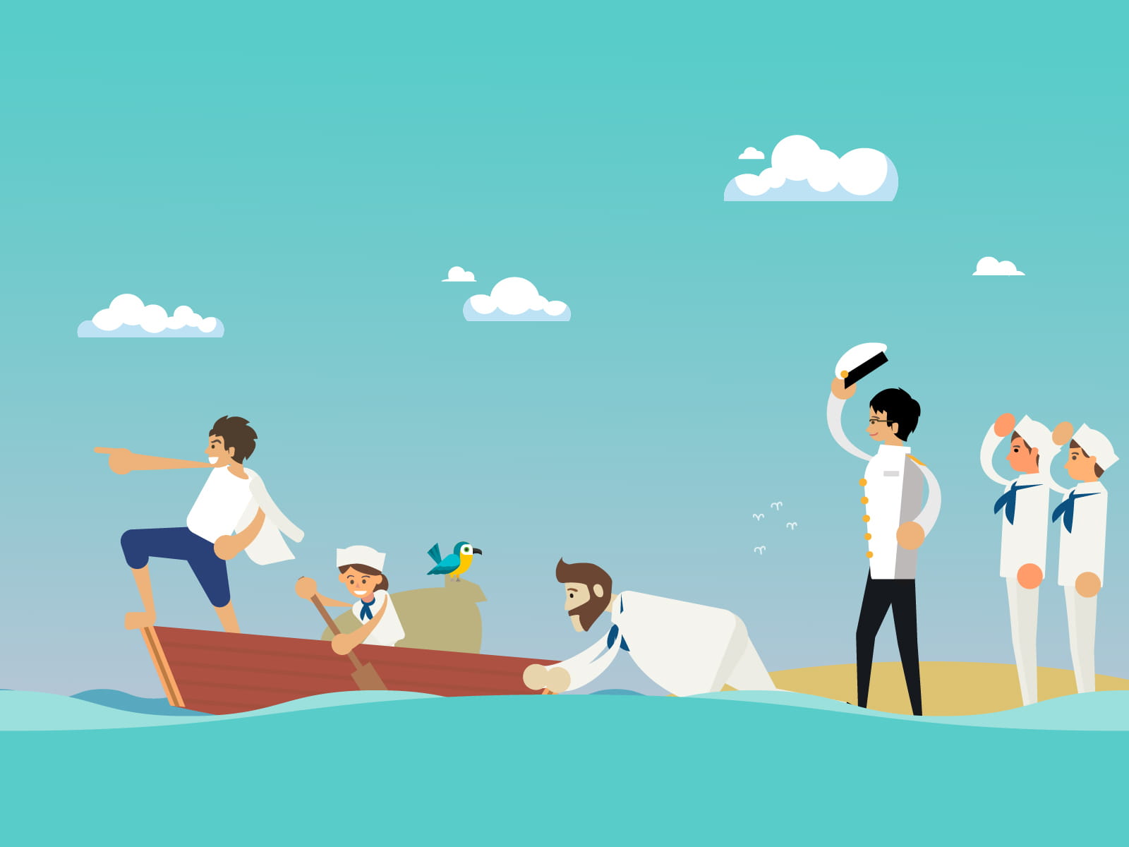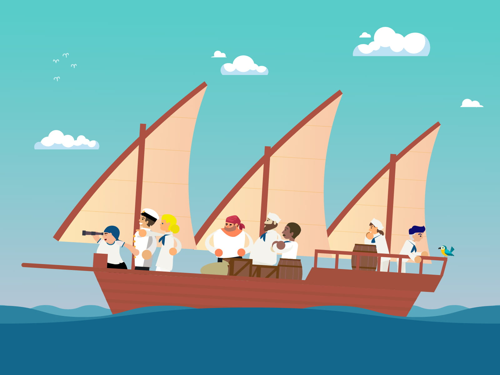 そんな中、この小さな島に偶然立ち寄った海賊船の船長と運命の出会いがある。海賊たちはこの危険な海域でも恐れることなく島々を渡り歩く強者。少年はその船の船長に頼み込みクルーの一員となる。一番下っ端の少年は雑用ばかり。少年の壮大な夢を笑い飛ばす人もいたが、船長や一部の仲間は応援してくれた。少年は船長や船員、島の人々に触れ合いながら、逞しく育っていく。そんな船旅の中で、それぞれの島が抱える問題に気が付く。・船大工の技術がないため、船を持てない島・この海域には不向きな大型船・正確な海図を持っていない船団島の人々がより豊かに暮らせるには、島と島を結ぶ航路の重要性、海を熟知することだと気が付き、少年は航海術を学び、海域の海図作りに励む。副船長となった少年はいつしか大人になり、自分の船を手に入れた彼は大宴の夢を叶えるべく、数人の仲間と共に彼の航海が始まる。